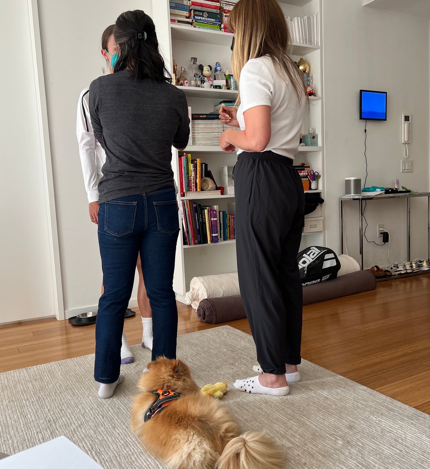 During COVID, we ditched the office and held masked fittings at Denise’s apartment. Alfie, her rescue Pomeranian, supervised to make sure each piece was fit perfectly.