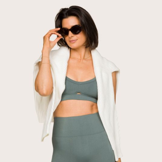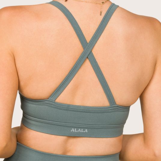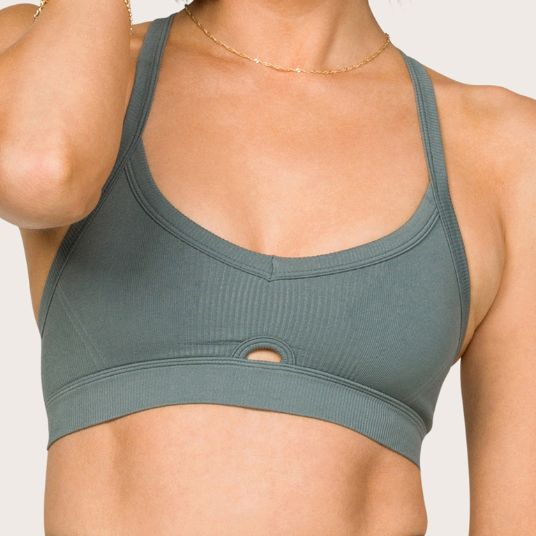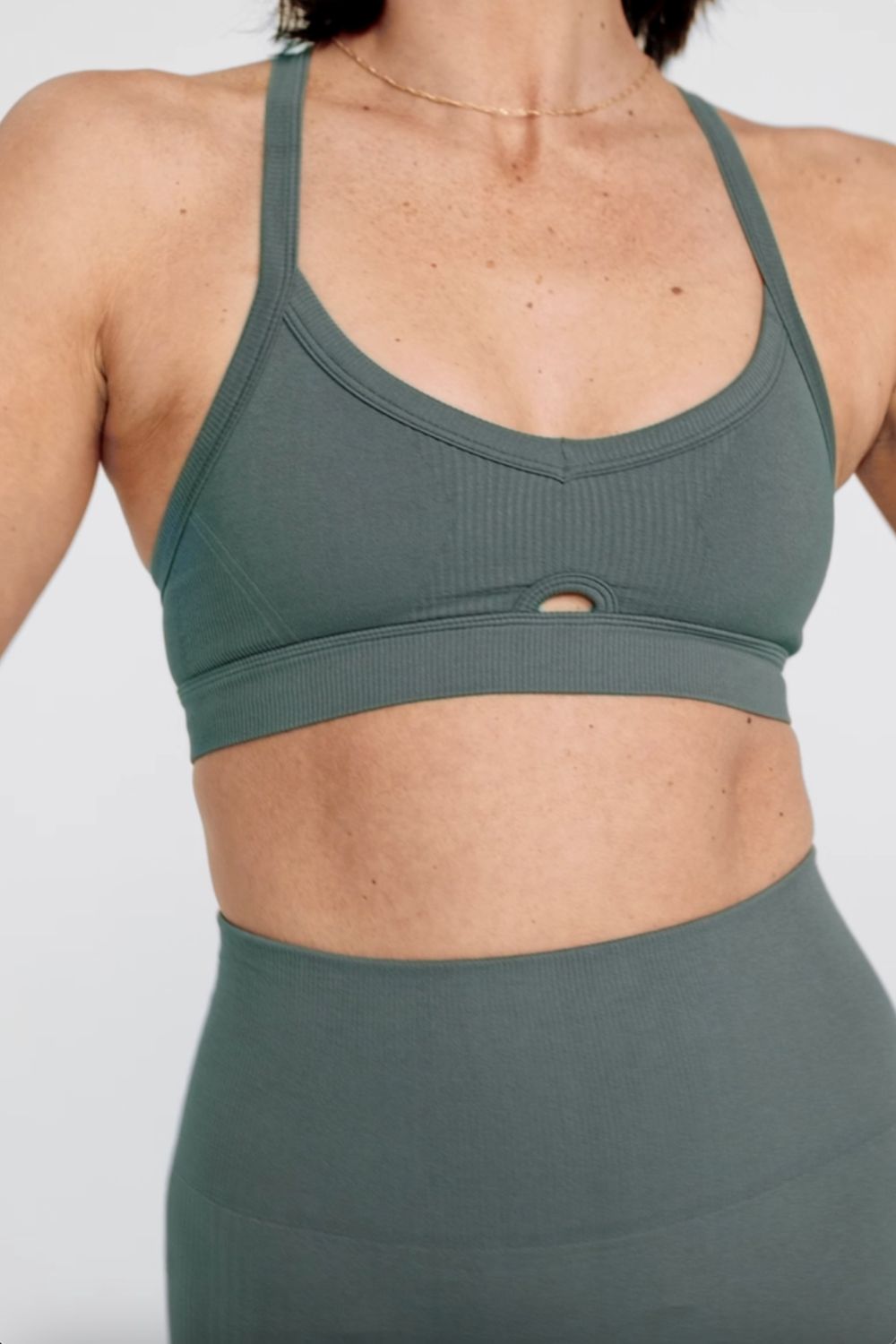 We've taken seamless bras to a new level. Introducing the Barre Cami Bra, the newest addition to our Seamless collection, featuring a keyhole opening in front and crossover straps in back to create a sage green low impact sports bra.