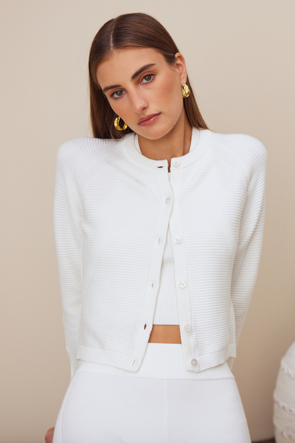 Courtney is 5'10.5", 33" Bust, 25" Waist, 36" Hip, and is wearing size Small button down white cashmere cardigan.