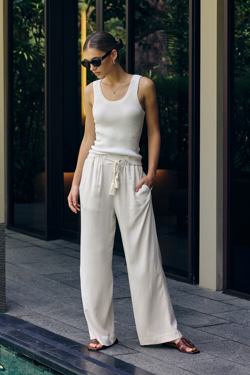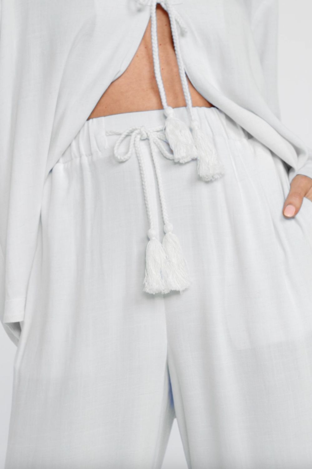 Crafted from a blend of linen and rayon, these breathable pants offer a luxurious drape and an incredibly soft hand feel. Designed for ultimate comfort, these high-rise pants feature an elastic waistband, a stationary tassel tie, and wide straight legs. With practical pockets and versatile styling options, they effortlessly transition from beach days to brunch outings, showcasing the epitome of laid-back elegance.